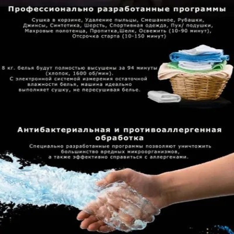 Сушильная машина Kuppersbusch T 40.0 AT AnthraciteПрограммы/дополнительные программы: Автоматические программы для хлопка и немнущихся тканейОт степени сушки «под утюг» до «экстра-сухое»Специальные программыСушка в корзине, Удаление пыльцы, Смешанное, и другие программы: Рубашки, Джинсы, Синтетика, Шерсть, Спортивная одежда, Пух/ подушки, Махровые полотенца, Пропитка, Шелк, Освежить (10-90 минут), Отсрочка старта (10-150 минут)ИзбранноеСохраняет до 6 Ваших любимых программДополнительные функцииАнтибактериальная обработка, Бережный уход +, Сушка +, Отсрочка старта, Экспресс8 кг белья будут полностью высушены за 96 минут («в шкаф»)Лимитированная коллекция в цвете антрацитПреимущества: Большой цветной дисплей 4,3’’Корзина для сушки деликатных тканей и спортивной обувиСушильная машина конденсационного типа с технологией Heat Pump и система самоочистки Autoclean для эффективного использования электроэнергии на протяжении всего срока службы машиныВысший уровень эффективности конденсацииПрограмма антибактериальной обработки для гигиенической сушки бельяПрограмма «Удаление пыльцы» позволяет очистить ткани от пыльцыПревосходная шумоизоляция, макс. 61 дБ(А)Светодиодная подсветка барабанаЗащита от складокЭлектронная система измерения остаточной влажности бельяИндикация хода программы и времени до окончания программы, отложенный запуск – до 7 днейРегулируемый по интенсивности акустический сигнал окончания программыУгол открывания люка – 180°, диаметр люка – 36/31 смВозможность перенавески люка (правая/левая)Защита от детейКонтроль температурыСпециальные программыСушка в корзинеВлажные вещи из шерсти желательно как можно меньше подвергать воздействию, так как они имеют тенденцию сморщиваться и садиться. Спортивная обувь может повредить барабан из-за своего веса. Использование корзины позволяет выполнять деликатную сушку без перемещения отдельных стойких к машинной стирке предметов: шерстяные изделия, спортивную обувь из синтетических материалов или искусственной кожи, шапки, велосипедные шлемы, мягкие игрушки, игрушки и пр.СмешанноеЭта программа оптимально подходит для сушки смешанной партии белья из хлопка и синтетикиДругие программыИспользуйте эти программы для оптимальной сушки различных видов текстиля, например сорочек, блузок, джинсов, шерсти и пр.Дополнительные программыАнтибактериальная обработкаПри выборе этой программы увеличивается время дополнительной сушки, что позволяет уничтожать большинство бактерийБережный уход плюсДля бережной сушки деликатных вещей. Температура сушки пониженаОтсрочка стартаС помощью данной программы запуск программы можно отложить на более позднее время в соответствии со своим привычным образом жизни (например, для использования льготного ночного тарифа на электроэнергию)Сушка +При выборе этой программы временно увеличивается степень сушки — на время работы выбранной программыВремяПри открытии программы с управлением по времени отображается минимальное время выполнения программыЭкспрессДля быстрой сушки небольшой партии или отдельных изделий из хлопка, синтетики или смешанной тканиХарактеристики:Конденсационная сушильная машина с технологией Heat PumpЗагрузка 1-8 кгСтационарная установка/установка в колоннуНавеска люка левая/праваяВозможность изменения навески люкаРазмеры п
